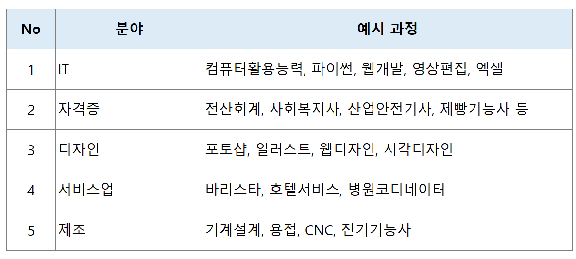 지원받은 금액으로는 IT, 디자인, 요리, 제과제빵, 자격증 과정, 취업 연계 교육 등 다양한 직업훈련을 들을 수 있고, 온라인 강의도 가능해서 시간과 장소에 구애받지 않고 학습이 가능합니다.