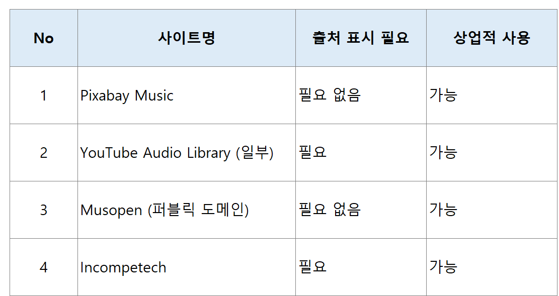 다음 사이트들은 출처 없이도 상업적으로 사용 가능한 음악을 제공합니다.