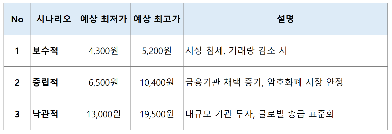하지만 CBDC 연계, 대규모 투자 유입 같은 초대형 호재가 발생하면 1만 원 돌파도 가능하다고 봅니다.
