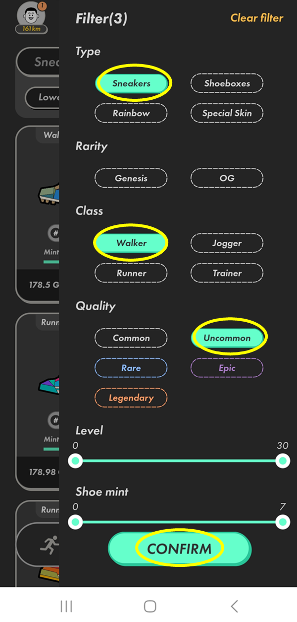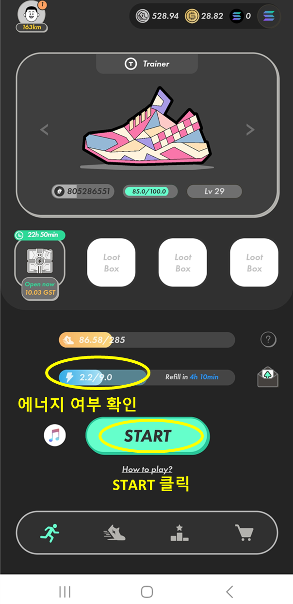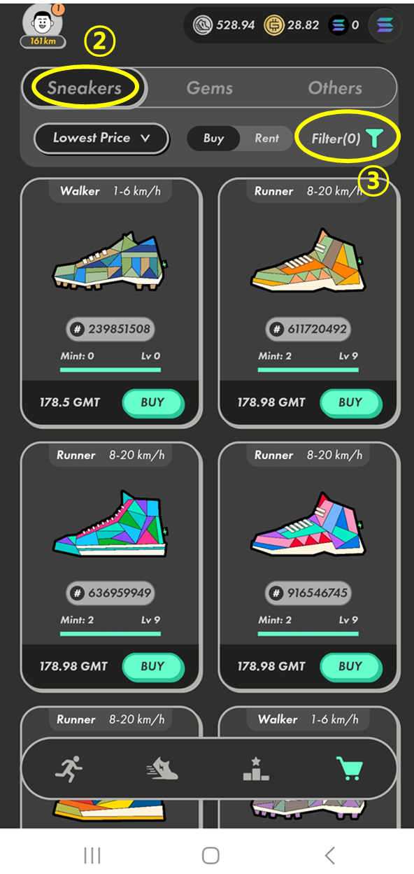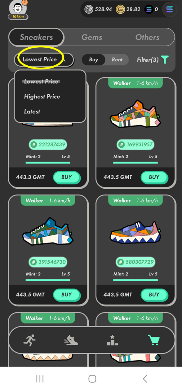 스테픈 앱에서 수익을 창출하기 위해서는 운동화 NFT를 구매해야 합니다. 마켓플레이스에서 원하는 운동화를 선택하고, 필요한 암호화폐를 통해 구매 할 수 있습니다. (투자금 필요!)