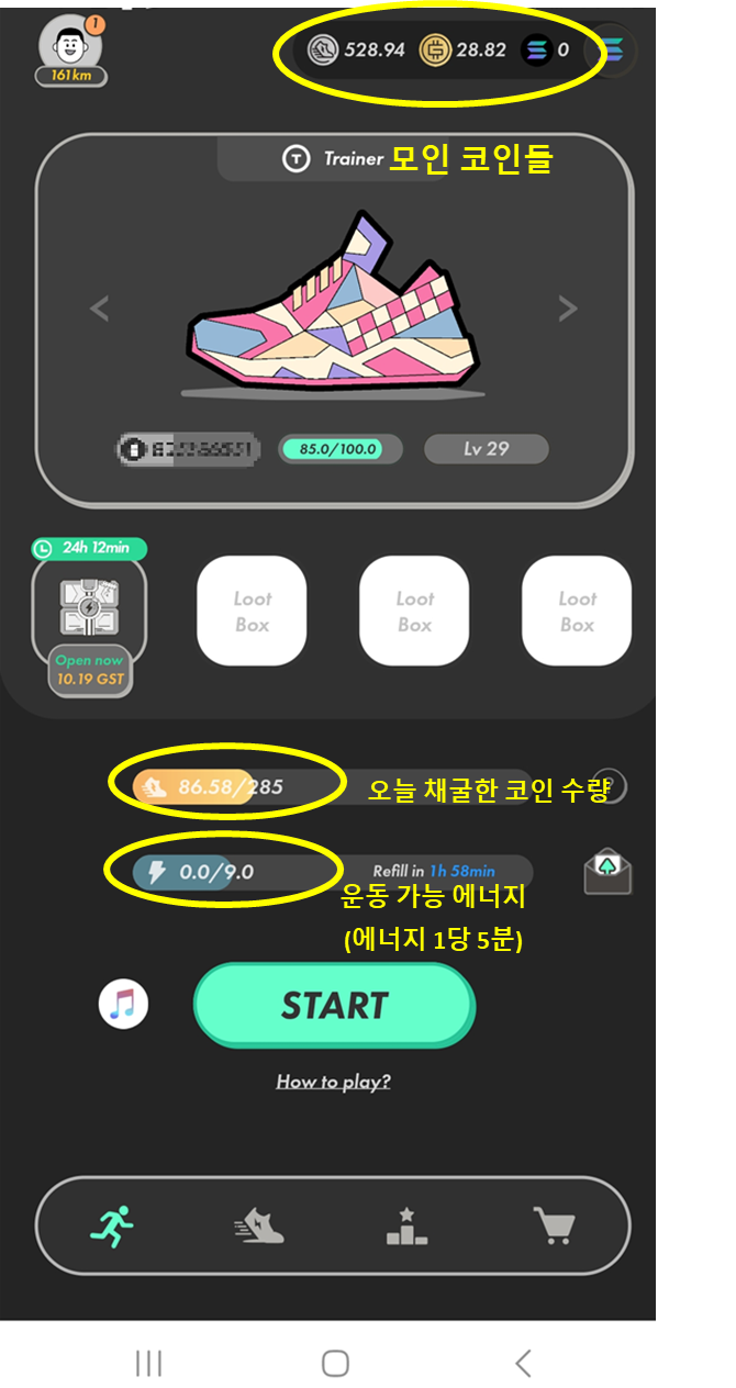 운동화 NFT를 착용하고 운동을 시작하면, 걸음 수에 따라 암호화폐가 적립됩니다. 적립된 암호화폐는 마켓플레이스에서 운동화 구매에 사용하거나 외부 지갑으로 전송하여 현금화할 수 있습니다.