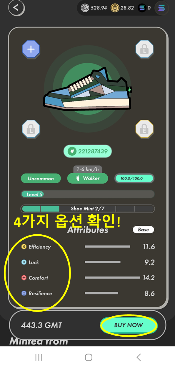 스테픈 앱에서 신발의 능력치 4가지 옵션은 아래와 같다.