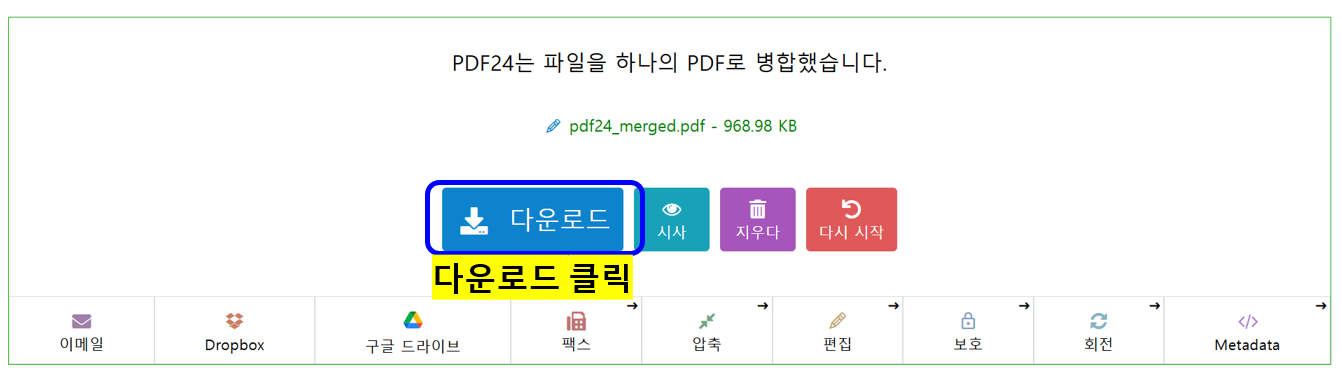 잠시만 기다리면 병합이 완료되고, 다운로드 버튼이 나타납니다.